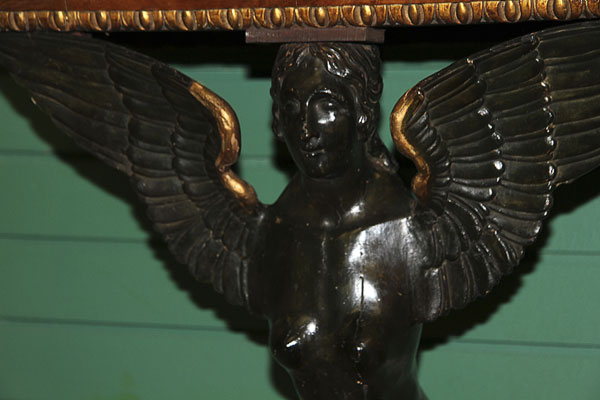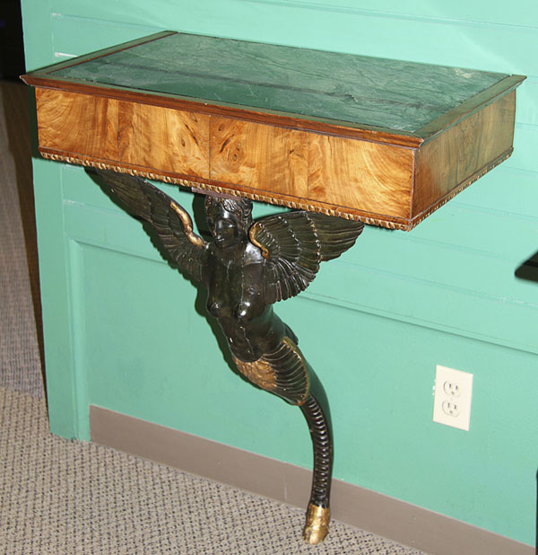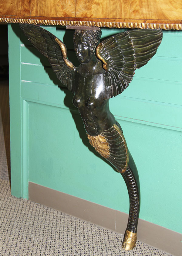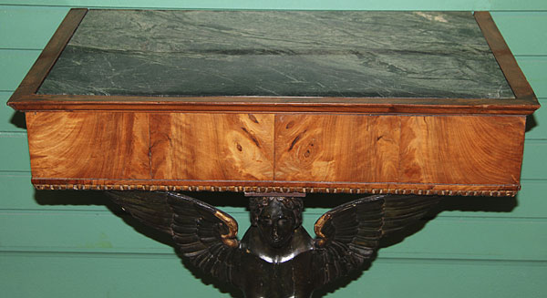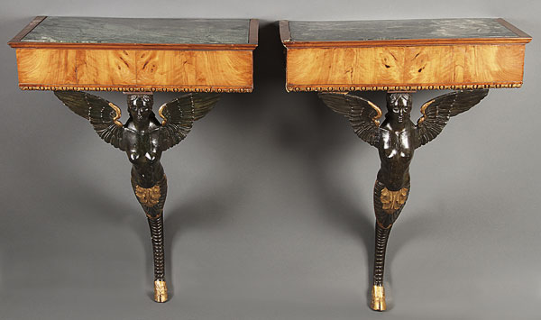 A PAIR OF FRENCH EMPIRE MARBLE, SATINWOOD AND CARVED EBONIZED CONSOLE TABLES, CIRCA 1800. Each with figural carved caryatid winged figural supports in ebonized wood with gilt highlights below a satinwood top with marble insert. Height 37.25 inches (94.7 cm), width 26.5 inches (67.2 cm), diameter 16 inches (40.75 cm).