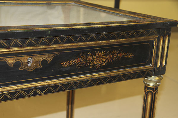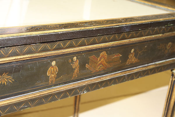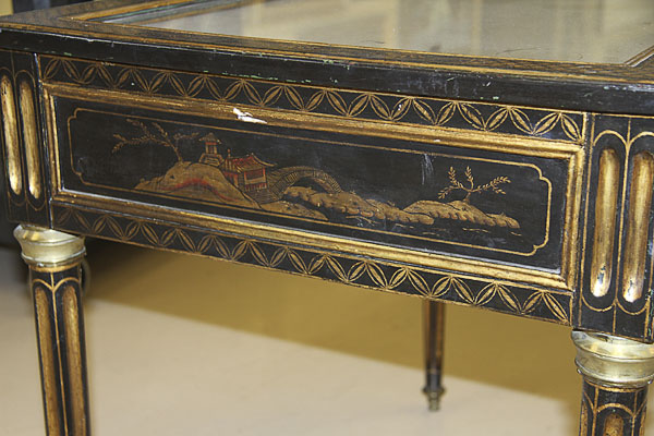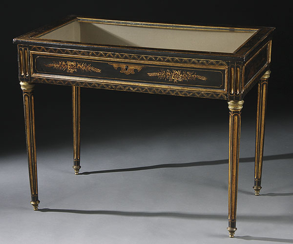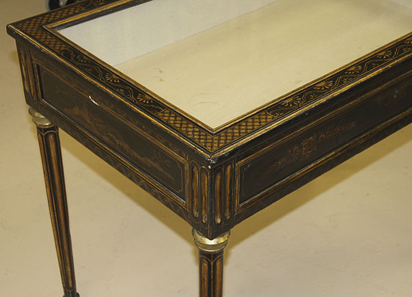 A VERY FINE BLACK JAPANNED AND GILT BRONZE CHINOISSERIE DISPLAY TABLE, CIRCA 1800. The rectangular table with lift top glazed lid below a base with gilt Chinoisserie scenic and floral decoration raised on fluted and gilt decorated legs with bronze mounts. Height 29 inches (73.7 cm), width 36.25 inches (92 cm), depth 22.25 inches (56.5 cm).
