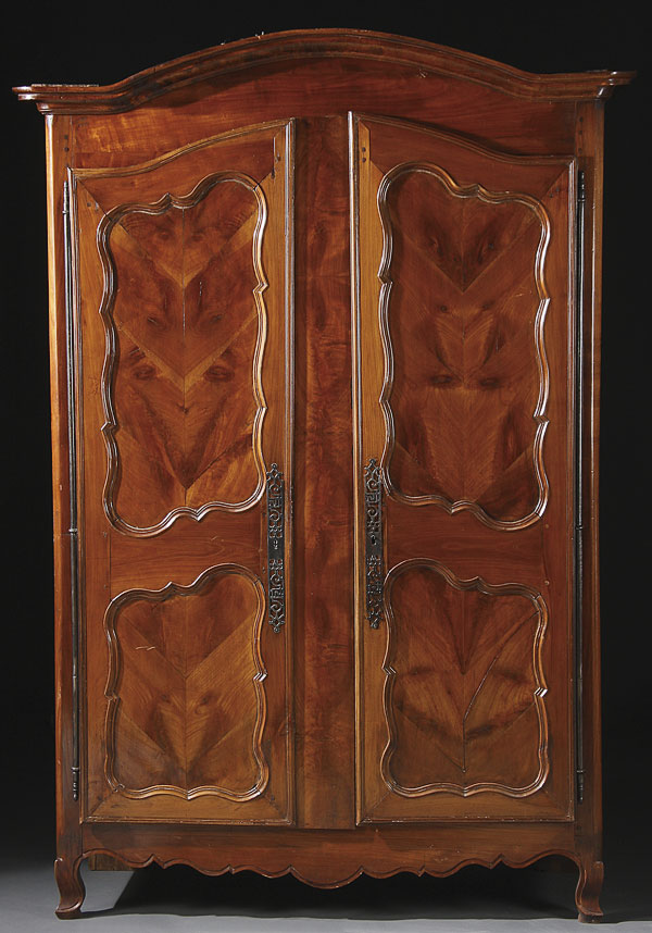 A FRENCH PROVINCIAL WALNUT AND BURLWOOD ARMOIRE, 19TH CENTURY. With iron hinge and iron scrollwork lock plates. Height 84 inches (213.6 cm), width 62 inches (157.7 cm), depth 21.5 inches (54.5 cm).