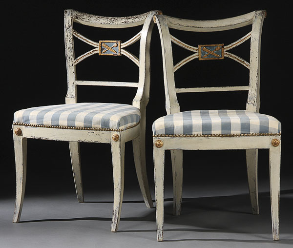 A PAIR OF FRENCH EMPIRE CREAM PAINTED CARVED AND GILT WOOD SIDE CHAIRS, EARLY 19TH CENTURY. With later upholstered seats. Height 31.5 inches (80 cm), width 19 inches (48.25 cm), depth 16.5 inches (42 cm).