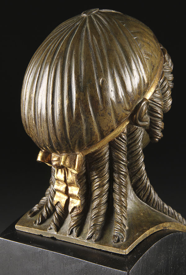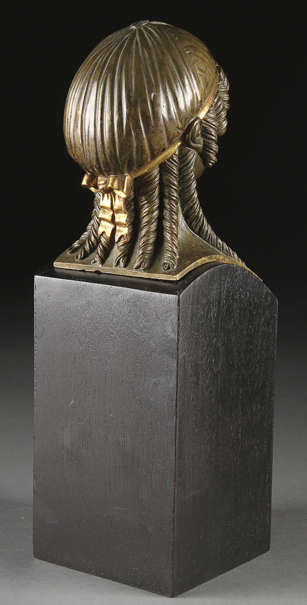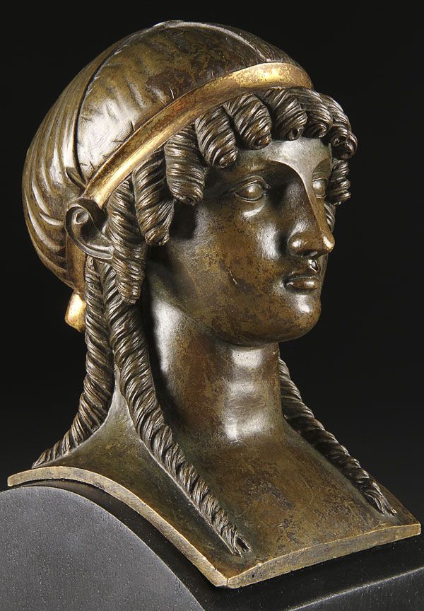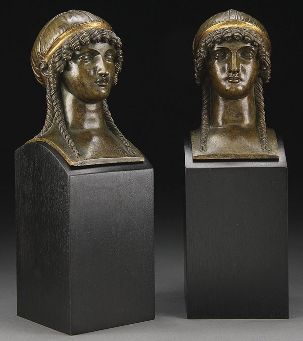 A VERY FINE PAIR OF NEO-CLASSIC PARCEL GILT AND PATINATED BRONZE BUST GARNITURES, 20TH CENTURY. Finely modeled in the form of a young beauty with curly locks and gilt headband, raised on a conforming ebonized wood plinth, apparently unsigned. Height 12.25 inches (31 cm).
