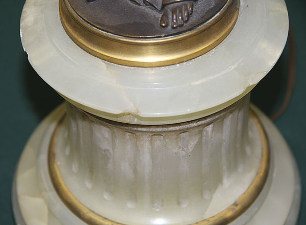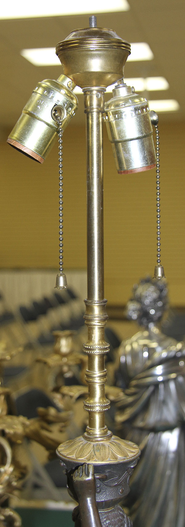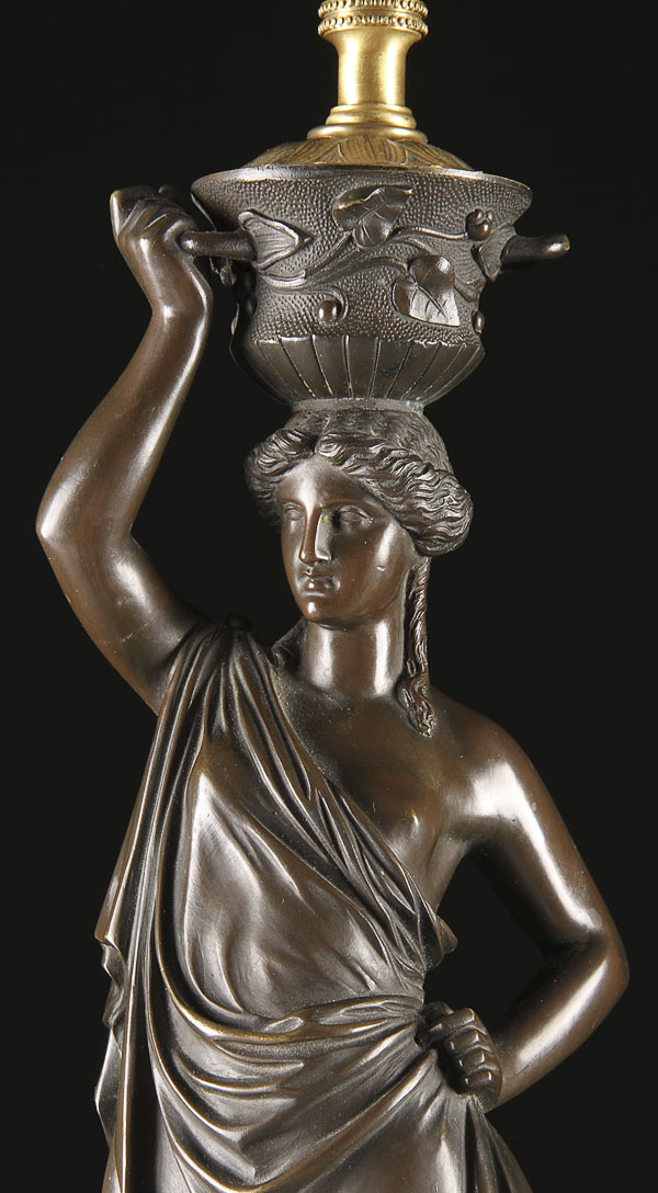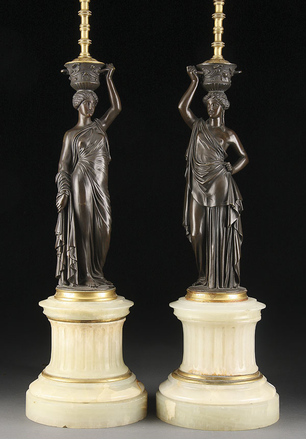 AFTER LOUIS VALENTIN ELIS ROBERT (FRENCH 1821-1874) A pair of bronze figural candelabra modeled as classical women supporting a handled urn, raised on fluted onyx pedestals and later converted to electric lamps, each inscribed on gilt mounts L.V.E. Robert. Total height, as illustrated, 26 inches (66 cm).