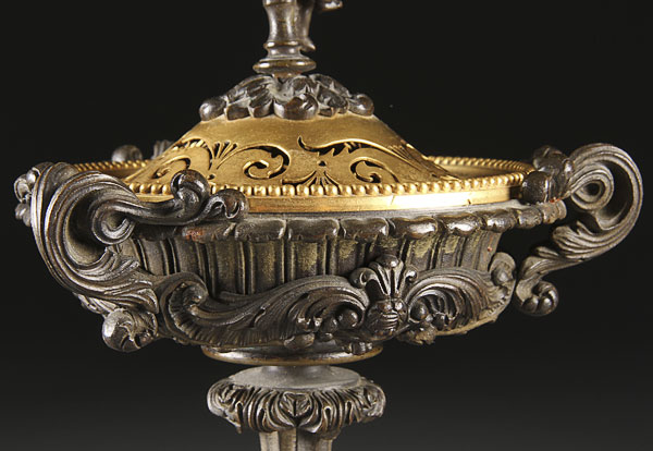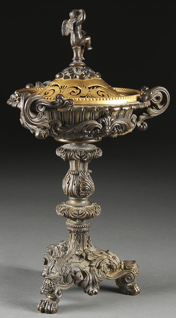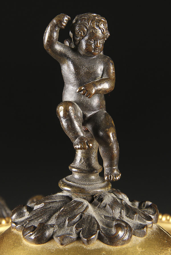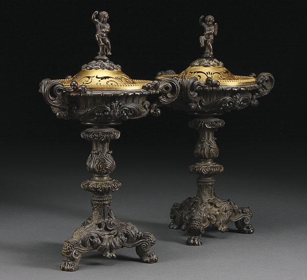 A VERY FINE PAIR OF FRENCH NEO CLASSIC GILT AND PATINATED BRONZE COVERED TAZZA, 19TH CENTURY. With reticulated domed covers and figural cherub finial raised on a three handled shallow pan with scrolled acanthus form tripod base. Height 12.25 inches (31 cm).