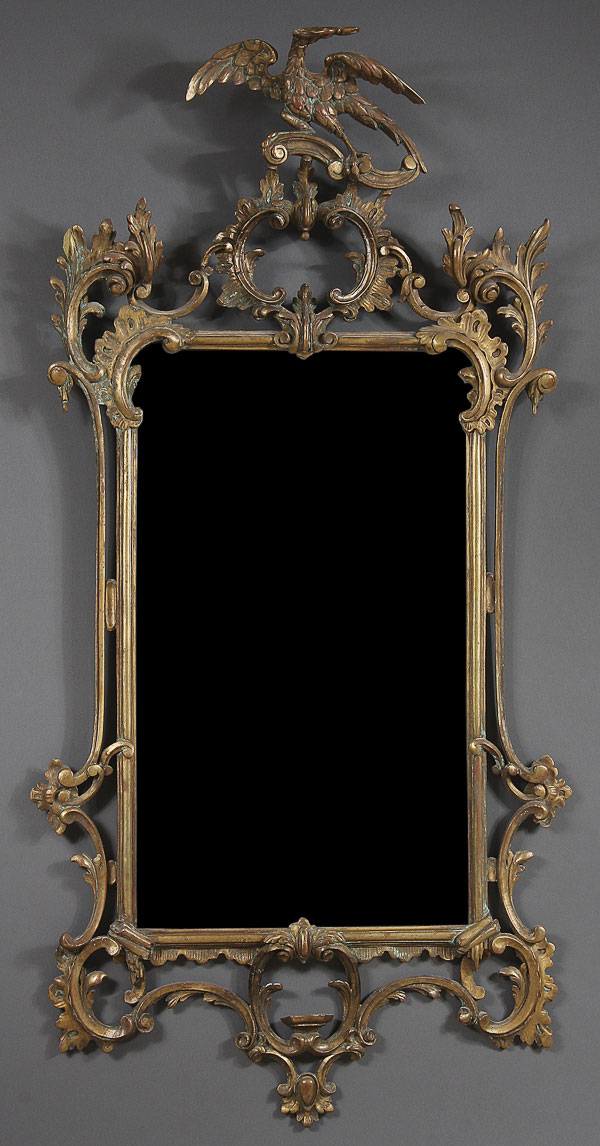 A VICTORIAN CARVED WOOD AND GILT ROCOCO WALL MIRROR. With carved open work scrolled acanthus foliates surmounted by a carved scrolled cartouche bellow a figural carved eagle finial. Height 51 inches (130 cm), width 25.75 inches (65.5 cm).