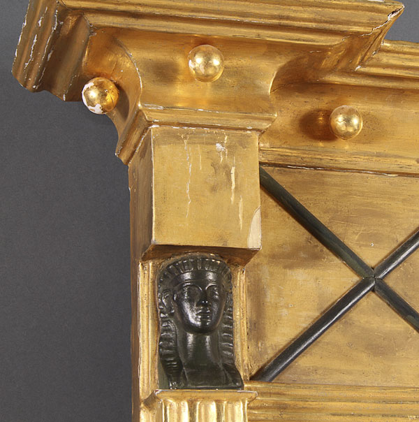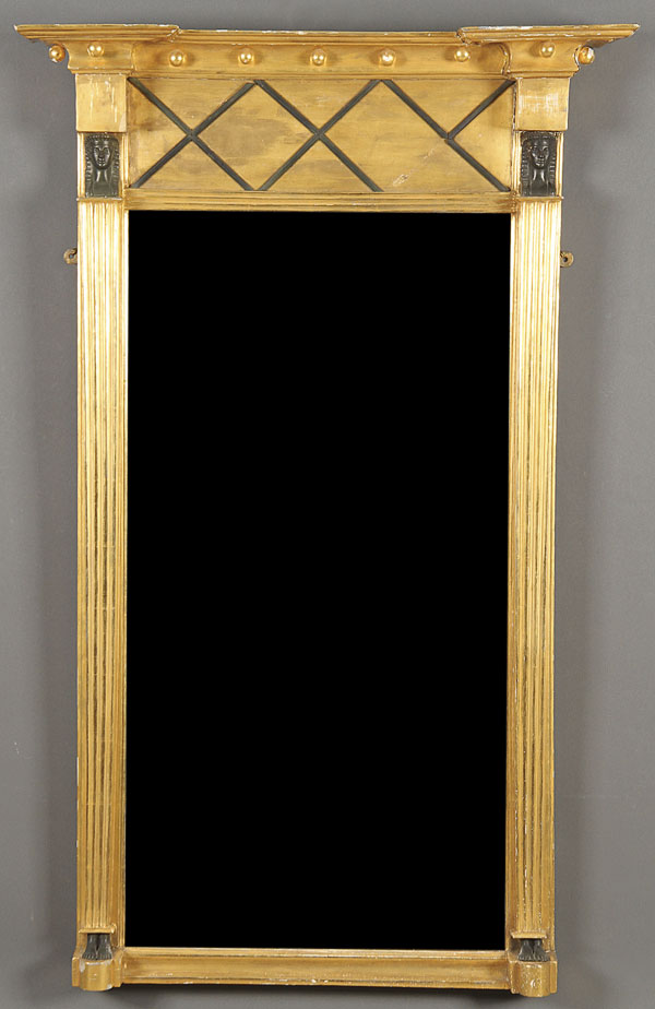 A FRENCH EMPIRE GILT WOOD AND BEVELED GLASS WALL MIRROR, EARLY 19TH CENTURY. With fluted squared columns terminating with bronze painted Egyptian facial masks. Height 45.5 inches (114 cm), width 28 inches (71 cm).