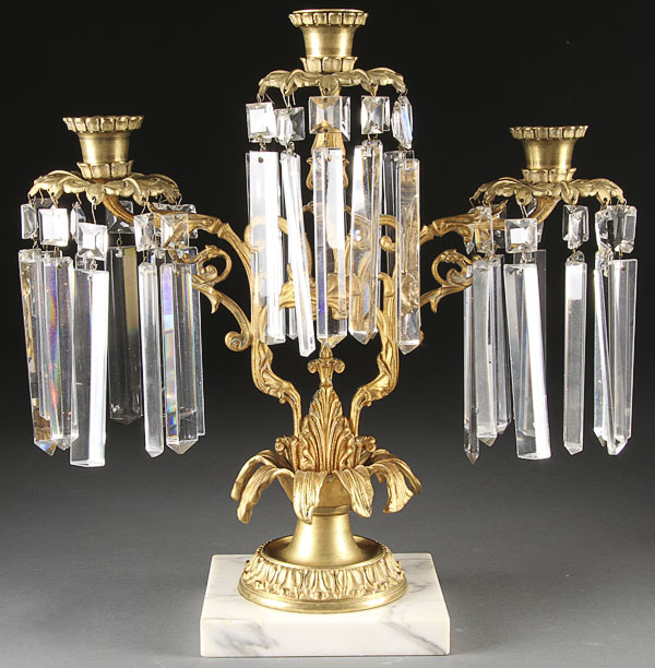 A GOOD PAIR OF EARLY AMERICAN GILT BRONZE CRYSTAL AND MARBLE CANDELABRA. With scrolled arms rising from a floral form base. Height 15.75 inches (40 cm).