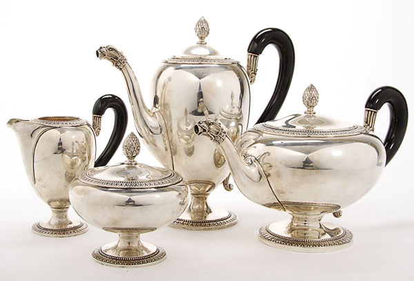 A CONTINENTAL SILVER FOUR PIECE COFFEE/TEA SERVICE, 20TH CENTURY. Comprising a coffee pot, tea pot, lidded sugar and cream jug with leaf and dart embossed banded decoration, ebonized wood handles and spouts terminating with lions head masks. Bearing Moscow hallmarks dated 1891, and AA maker's marks and 84 silver standard. Weight approximately 75 troy ounces.