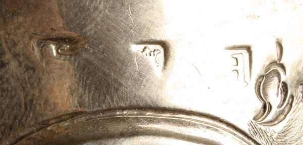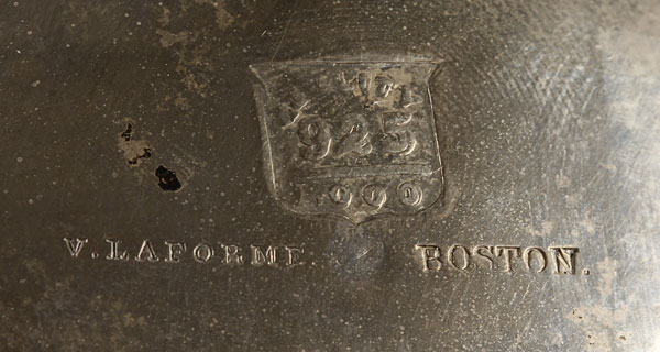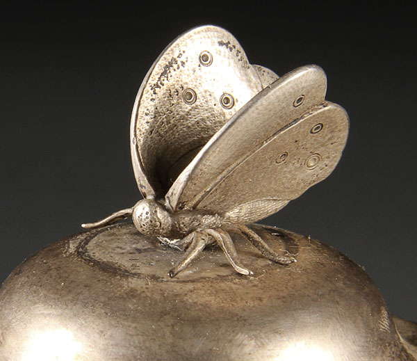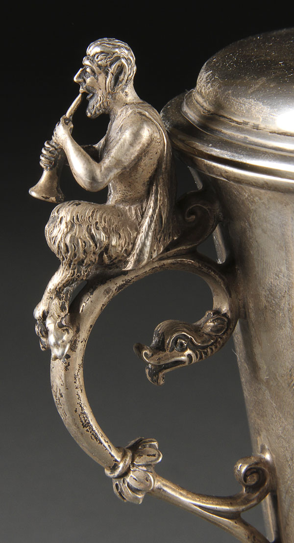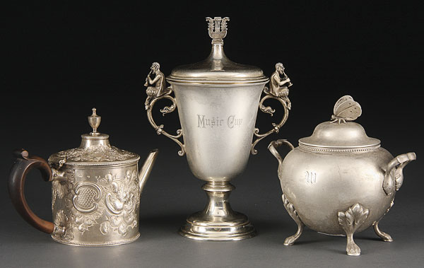 A THREE PIECE SILVER GROUP, 19TH/EARLY 20TH CENTURY. Comprising a fine Early Victorian English silver Argyll with repousse foliates (worn hallmarks), an English handled covered "Music Cup" with figural handles, circa 1927, and a Vincent Laforme, Boston, silver covered sugar bowl with butterfly finial, stamped ".925" Height 5 inches (12.5 cm) to 8.75 inches (23 cm). Weight approximately 39.4 troy ounces.
