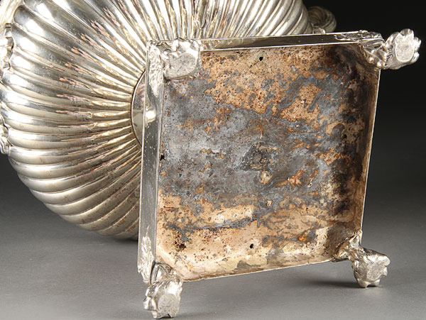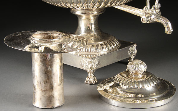 A FINE GEORGE III SHEFFIELD PLATE HOT WATER URN, CIRCA 1810. Of compressed bulbous form with fluted ribs raised on a flared pedestal with lion footed plinth, the interior with removable hot coal cylinder. Engraved crest on front, otherwise apparently unmarked. Height14.75 inches (37.5 cm).