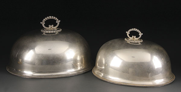 A PAIR OF VICTORIAN SILVERED FOOD DOMES. With detachable beaded handles, stamped "B&H Hand Raised". Length 16 inches and 18 inches (41 and 46 cm).