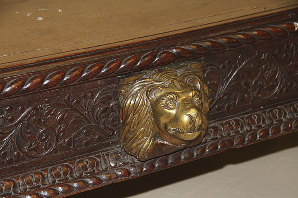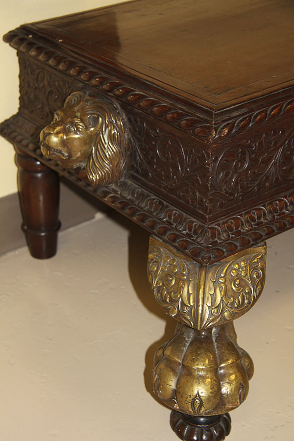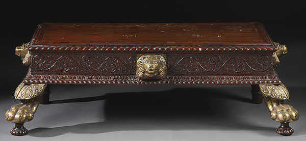 AN ANGLO-INDIAN CARVED WOOD AND GILT BRONZE MOUNTED VICTORIAN STAND, 19TH CENTURY. Carved wood with oversized gilt bronze mounted lions heads and claw feet. Possibly for use with an officer's campaign chest. Height 15.25 inches (38.7 cm), width 48 inches (122 cm), depth 22 inches (56 cm).
