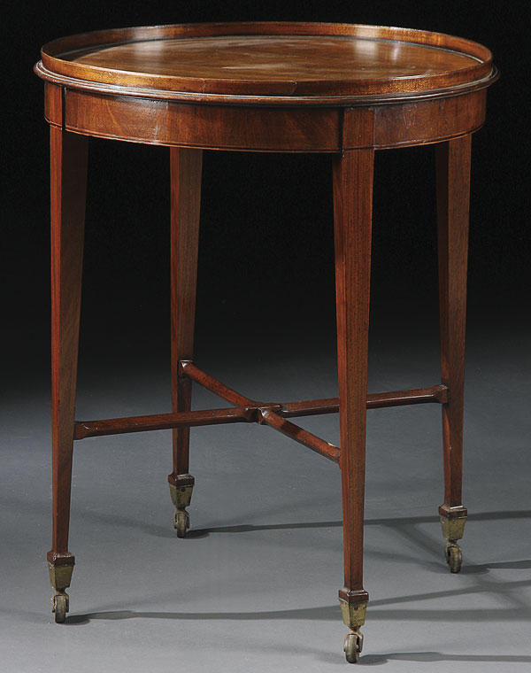 A GEORGIAN MAHOGANY OCCASIONAL TABLE, EARLY 19TH CENTURY. With round top raised on tapered legs with X form stretcher and bronze castors. Height 27 inches (69 cm), diameter 22 inches (56 cm).