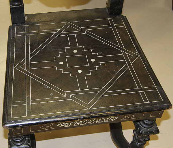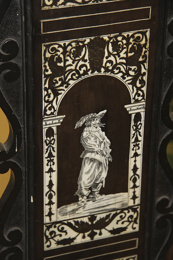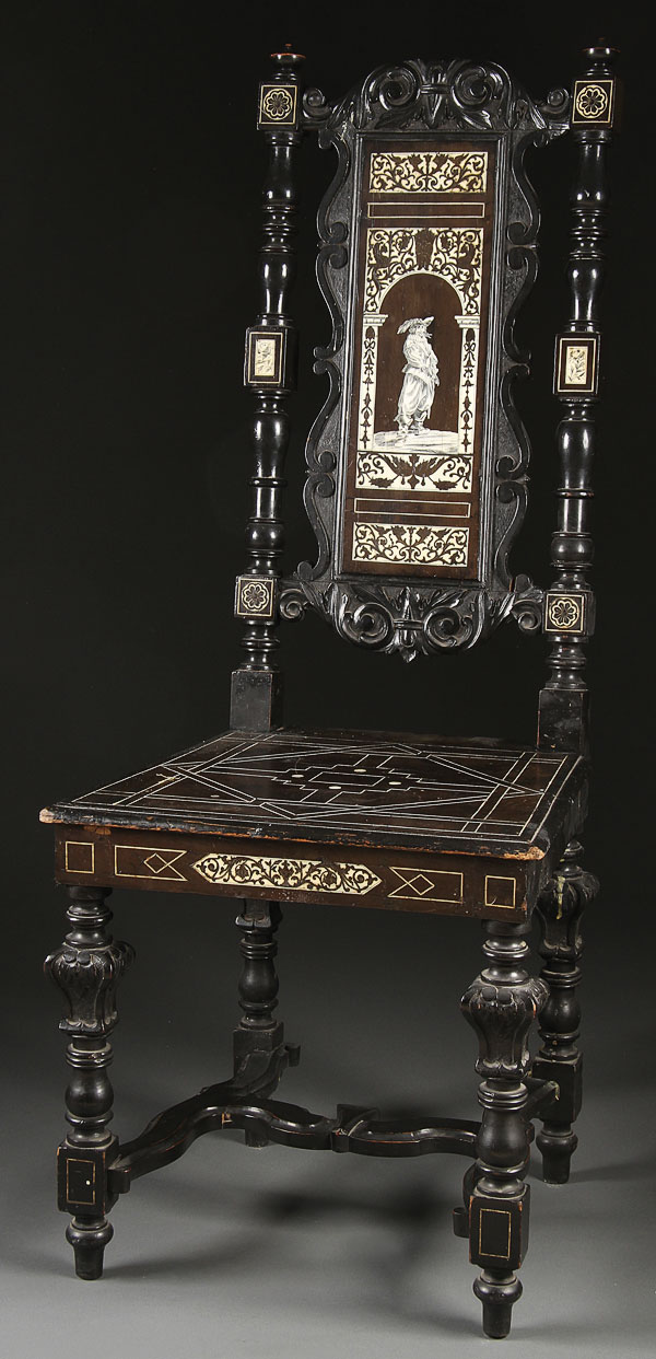 A VERY FINE MILANESE RENAISSANCE STYLE CARVED EBONIZED WOOD AND IVORY INLAID SIDE CHAIR, LATE 19TH CENTURY. Depicting a carved inlaid Renaissance style figure within an arched ivory inlaid portico. Height 46 inches (116.7 cm), width 18.75 inches (47.7 cm), depth 17 inches (43 cm).