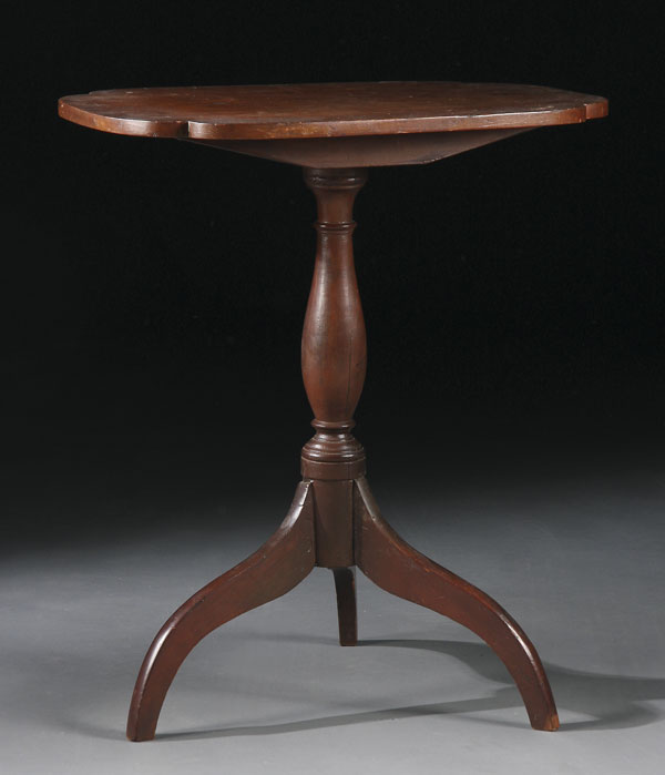AN EARLY AMERICAN WALNUT TILT TOP CANDLE STAND, EARLY 19TH CENTURY. On baluster pedestal raised on tripod scrolled legs. Height 28.5 inches (72.5 cm), width 24.5 inches (62.2 cm), depth 16.75 inches (42.5 cm).