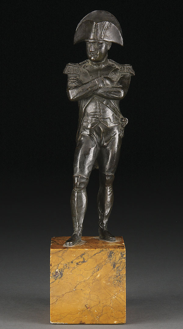 A BRONZE FIGURE OF NAPOLEON, EARLY 20TH CENTURY. Depicted in standing form with arms crossed surmounting a square butterscotch marble plinth. Height 11.5 inches (29 cm).