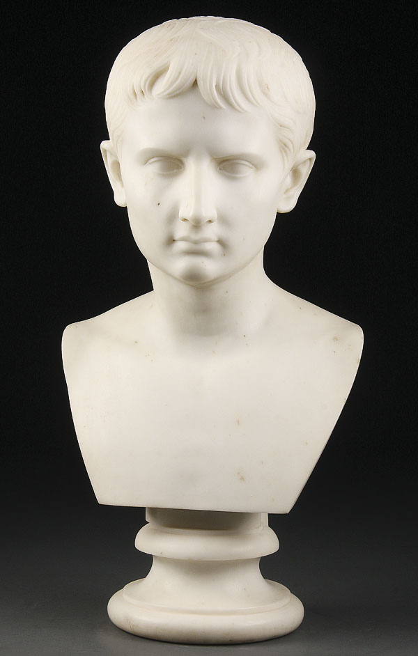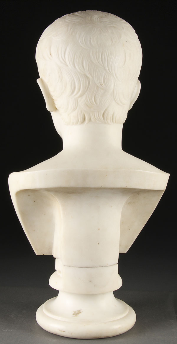 A 19TH CENTURY ITALIAN CARVED MARBLE BUST OF YOUNG CAESAR. Well sculpted in white marble and raised on a conforming white marble socle base. Height 21.5 inches (54.5 cm).