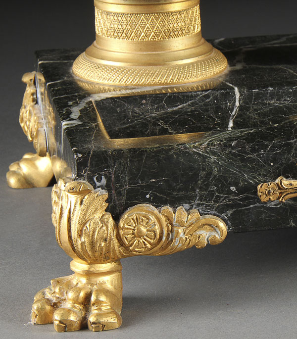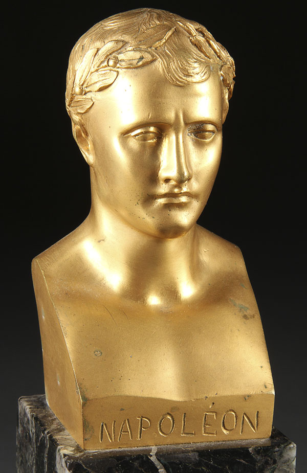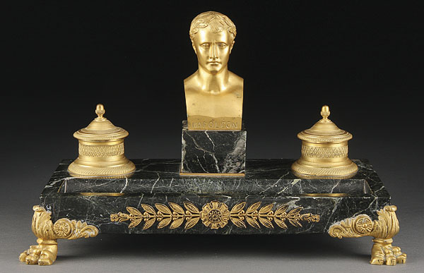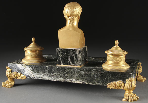 A GOOD GILT BRONZE AND MARBLE "NAPOLEON" INKSTAND, FRENCH 19TH CENTURY. The rectangular marble stand with hollowed pen rest below a gilt bronze bust of Napoleon flanked by two gilt bronze inkwells with tooled design, the whole raised on claw feet. Length 14.75 inches (37.5 cm).