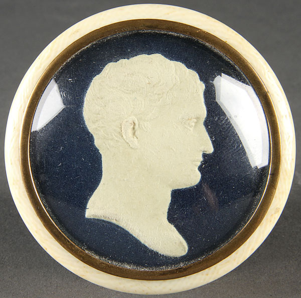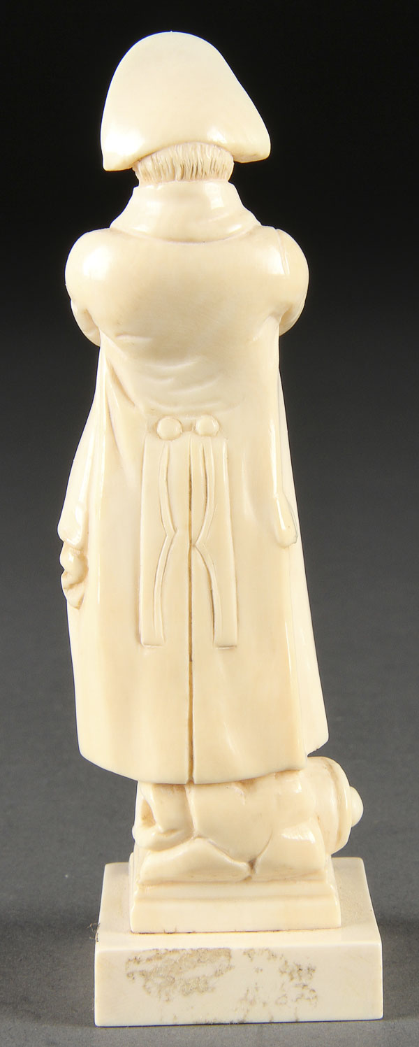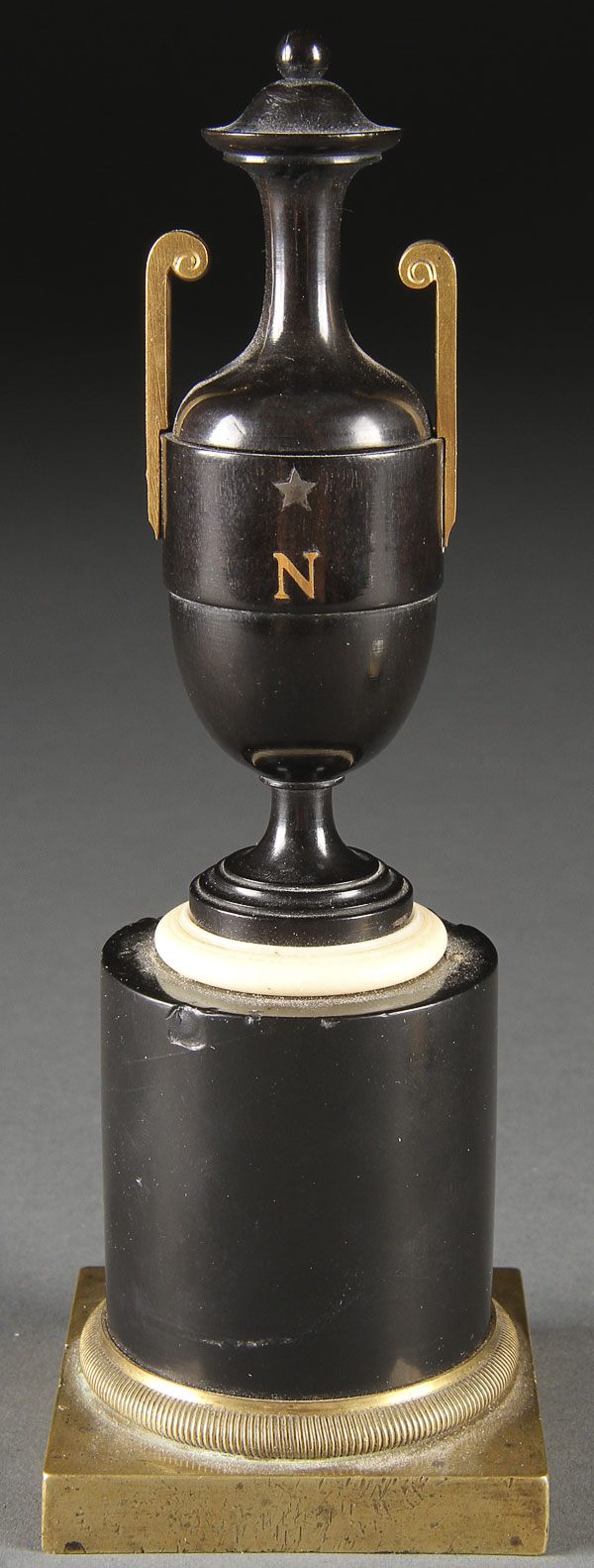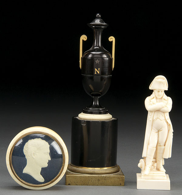 A GOOD CARVED IVORY AND BRONZE NAPOLEONIC GROUP, 19TH/20TH CENTURY. Comprising a well carved standing ivory figure, an ivory lidded box with profile portrait, and a gilt mounted black marble urn. The largest 6.5 inches (16.5 cm).