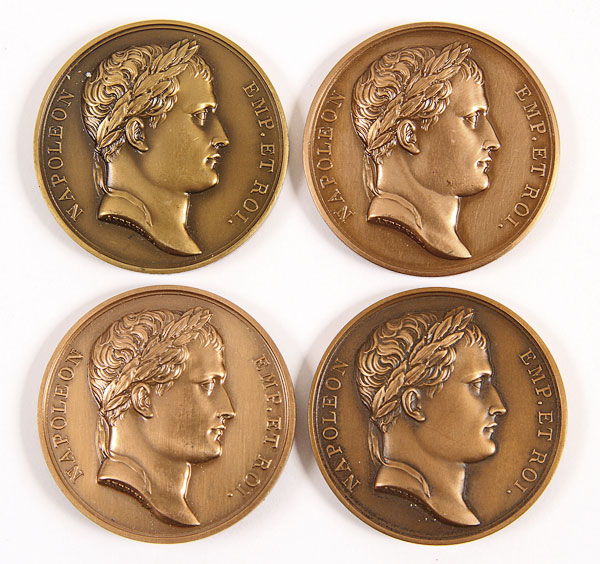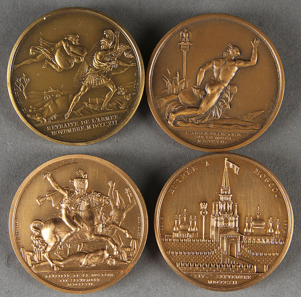 A GROUP OF FOUR NAPOLEONIC BRONZE MEDALS FOR THE 1812 FRANCO- RUSSO WAR. Comprising "The battle of Moscow", The French eagle on the Volga", "Retreat from Moscow", and "Entry into Moscow" Bramsen # 1162, 1164, 1166, and 1168. Diameter 1.5 inches (3.8 cm).
