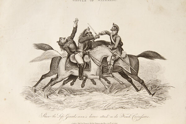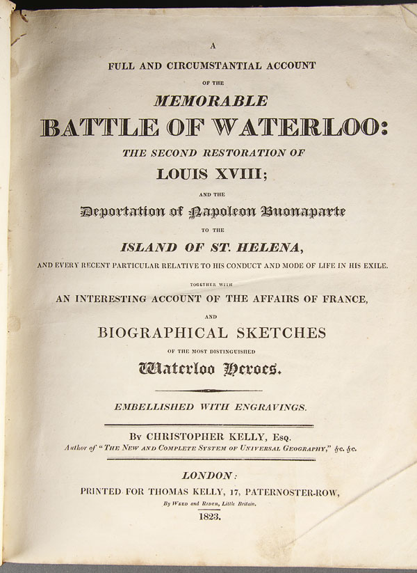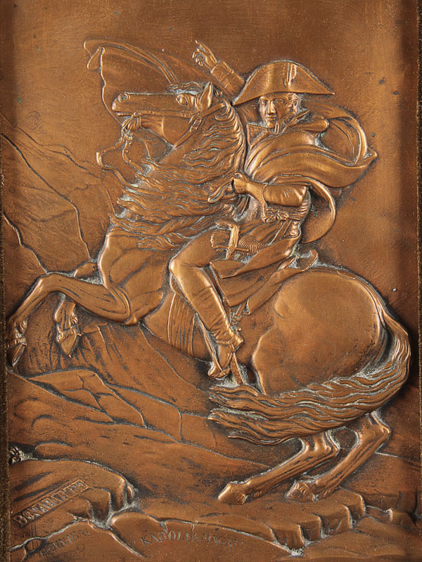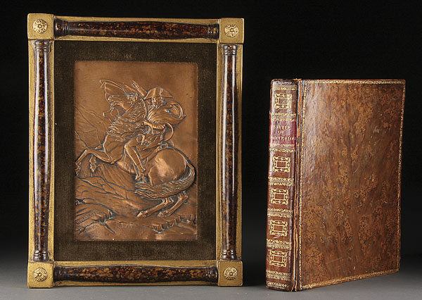 THE MEMORABLE BATTLE OF WATERLOO, 1823 BY CHRISTOPHER KELLY. Leather bound 510 pages with engravings, together with a copper embossed plaque depicting Napoleon crossing the Alps contained in a period gilt wood frame. The largest 14.25 inches x 11.25 inches (36.2 x 28.5 cm).