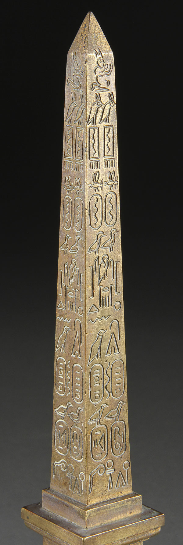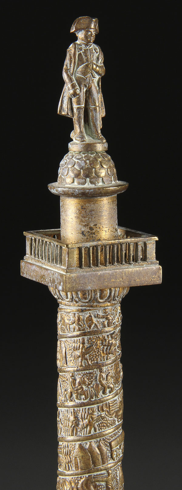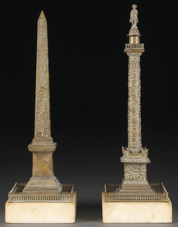 TWO FRENCH GILT BRONZE MODELS OF THE VENDOME COLUMN AND LUXOR OBELISK, LATE 19TH CENTURY. Each mounted on marble plinths. Height 10.75 inches (27.3 cm).