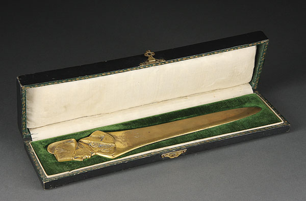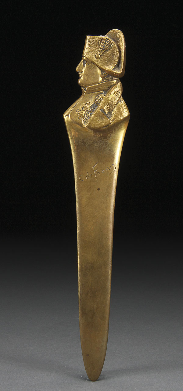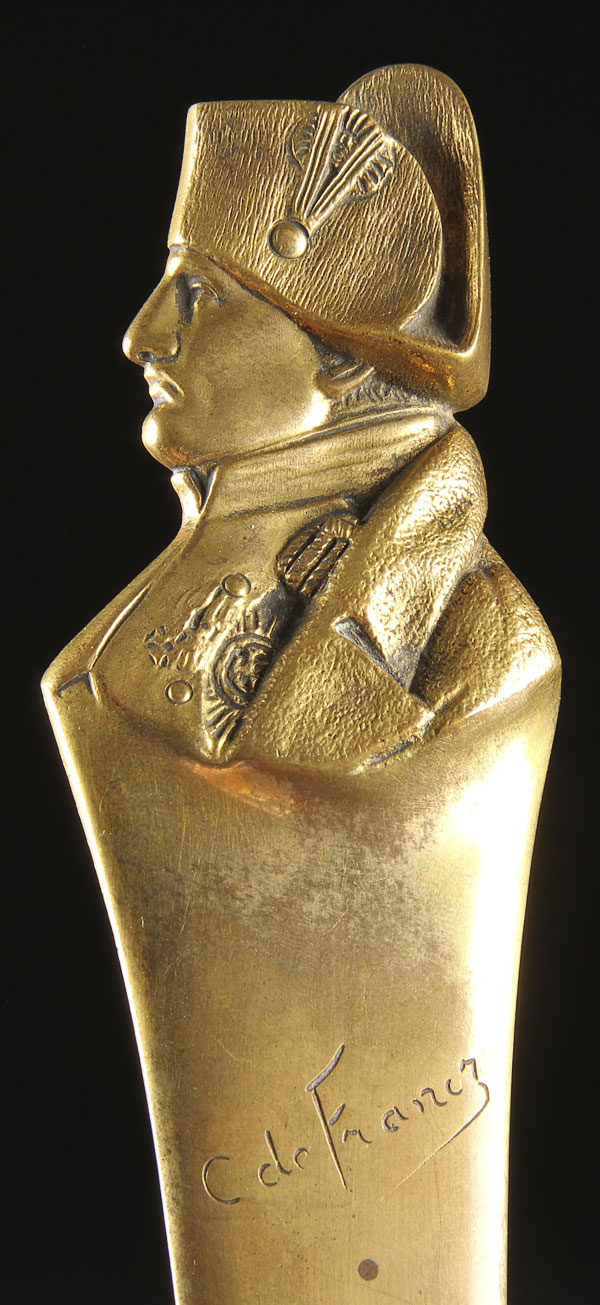A FRENCH GILT BRONZE PAPER KNIFE OF NAPOLEON, 19TH CENTURY. With profile bust and inscribed "C de France", contained in a lidded leather case. Length 10.5 inches (26.7 cm).