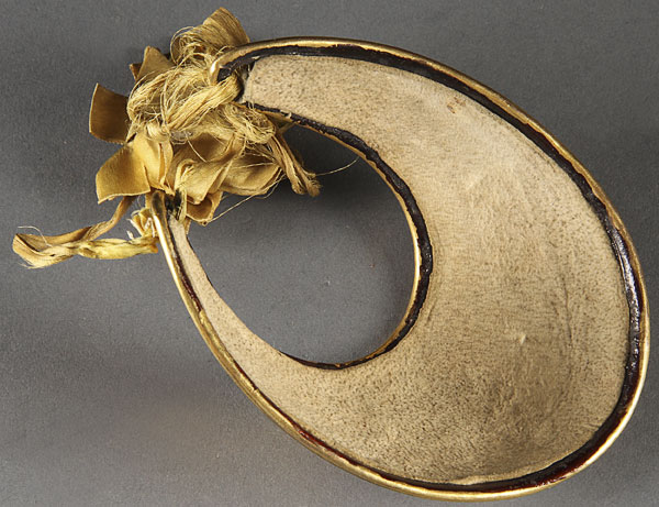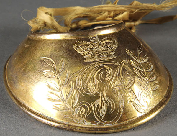 AN ENGLISH OFFICERS COPPER-GILT GORGET, 1796-1815. With an engraved GR cipher below a Hanoverian crown and within a laurel wreath. Length 4.5 inches (11.5 cm).