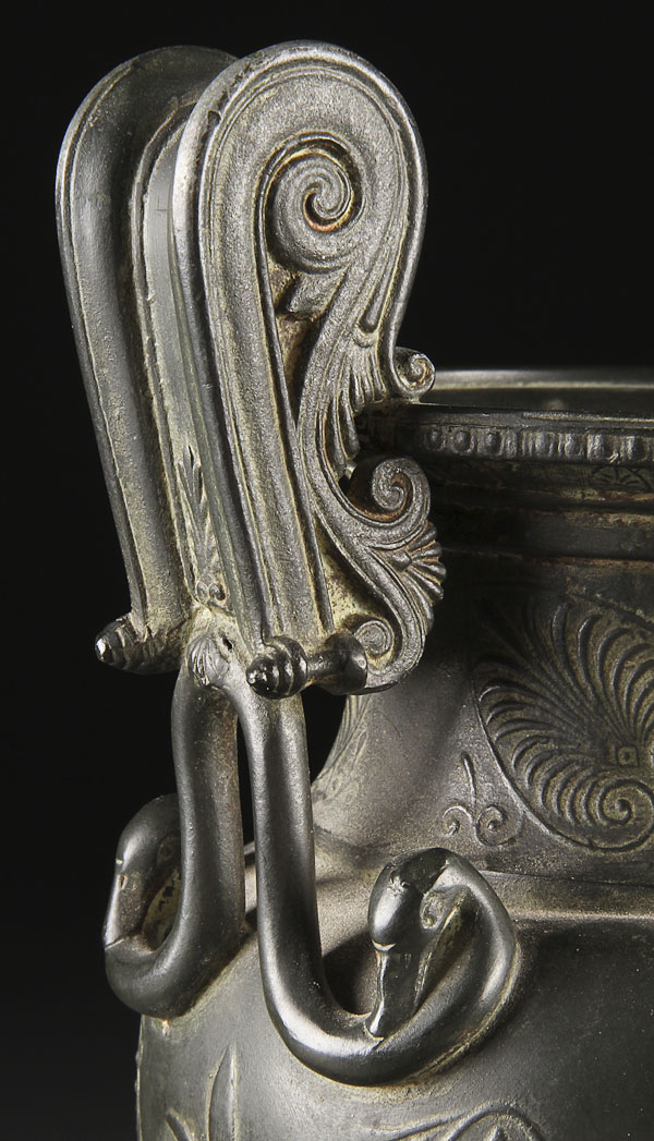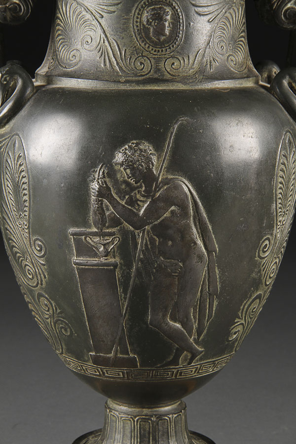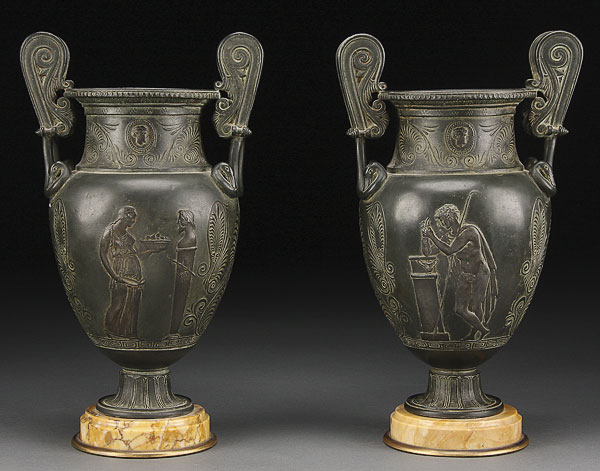 A FINE PAIR OF FRENCH NEO CLASSIC URNS, 19TH CENTURY. Cast metal with bronzed finish, sculpted with classical figures in relief. Height 11.5 inches (29 cm).