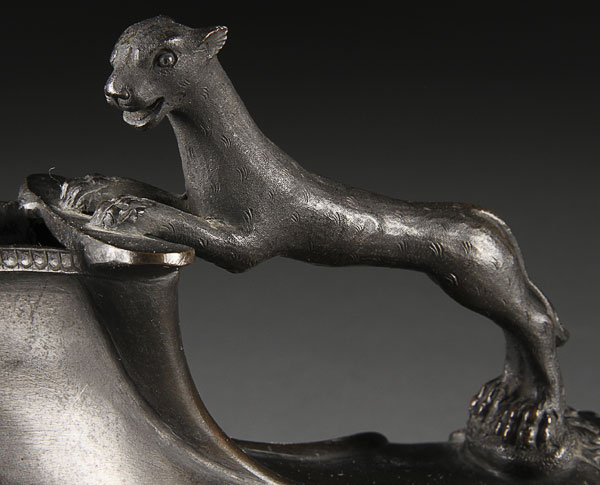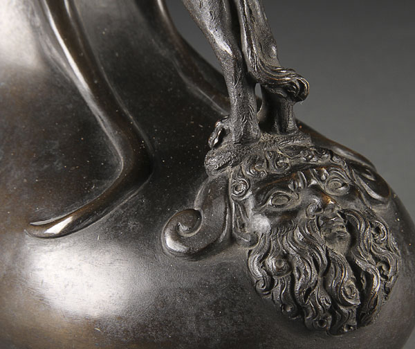 A PAIR OF CLASSICAL STYLE BRONZE WINE JUGS, PROBABLY FRENCH, 19TH CENTURY. With figural panther handles and facial masks terminals. Height 6.5 inches (16.5 cm).