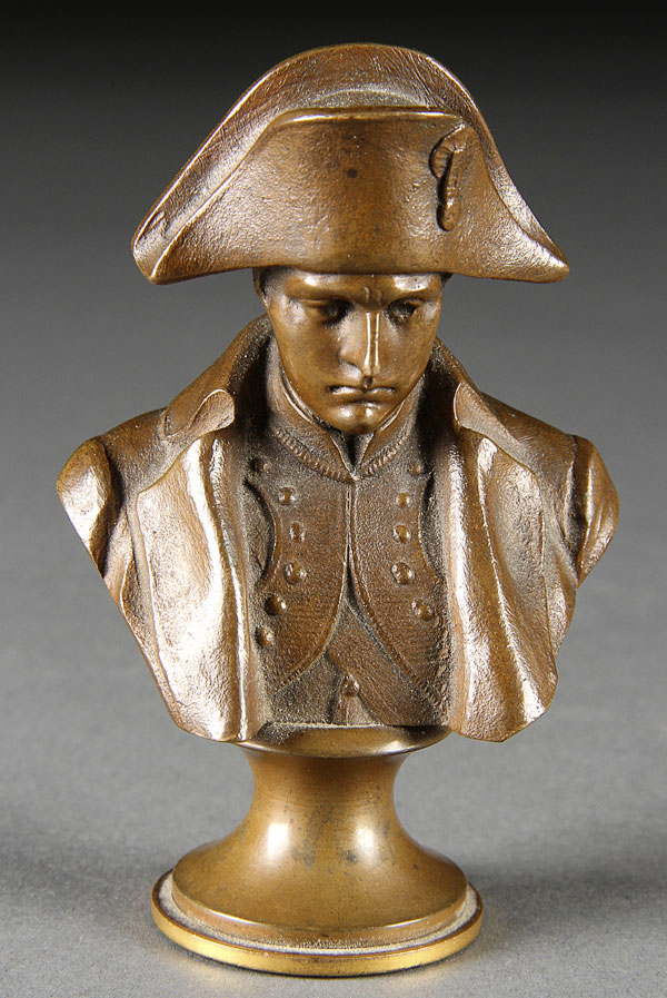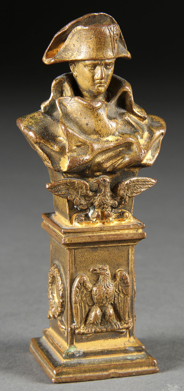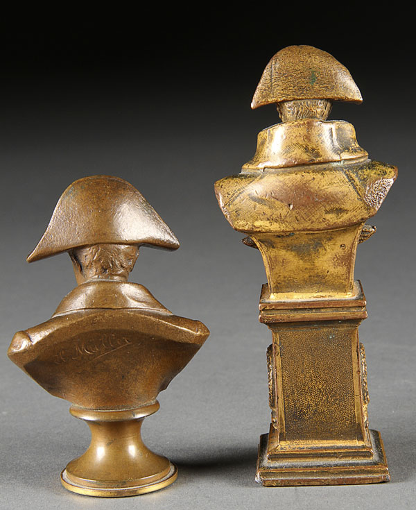 HANS MULLER (AUSTRIAN, 1873-1937). A miniature bust of Napoleon mounted atop a wasted socle pedestal with incised signature, together with an ormolu Napoleon with embossed eagle and laurel pedestal. Height 4.5 inches (11 cm).