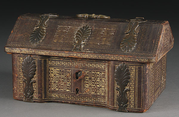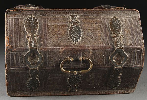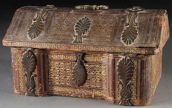 A GILT AND TOOLED LEATHER AND BRONZE MOUNTED CASKET, 18TH CENTURY. The domed cover with palmetto bronze mounts over a tooled leather surface with gilt decoration. Length 10.5 inches (26.5 cm).