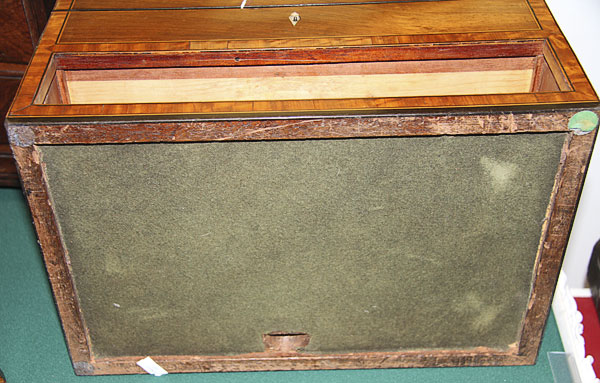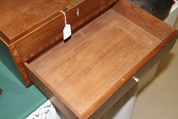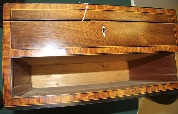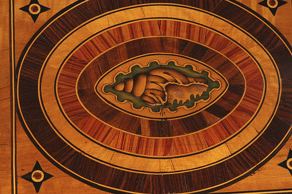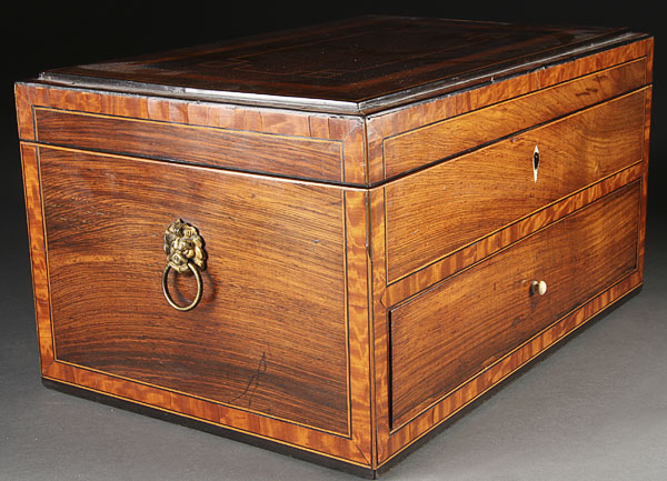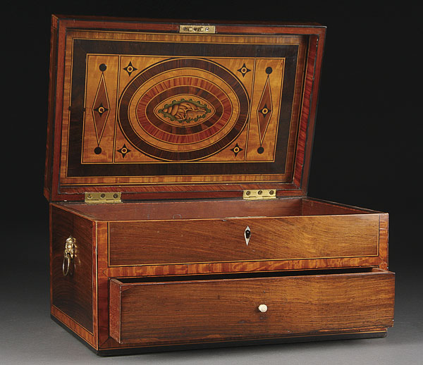 A VERY FINE ENGLISH INLAID REGENCY DRESSER CASE, EARLY 19TH CENTURY. The interior inlaid with various exotic hardwood in banded ovals surrounding a sea shell and fitted drawer with ivory pull. Length 15.25 inches (39 cm).