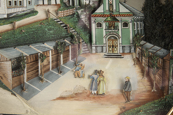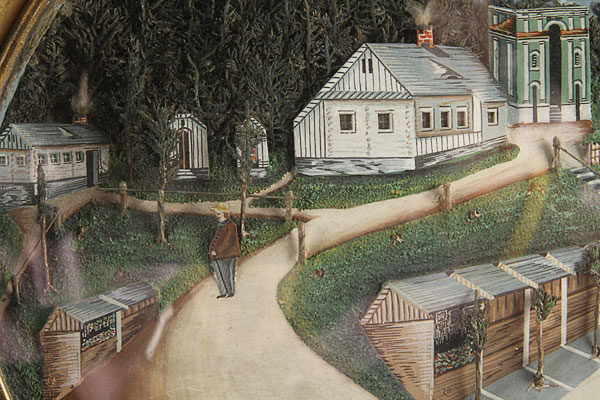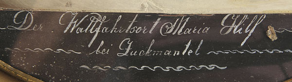 A VERY FINE 19TH CENTURY WATERCOLOR AND MIXED MEDIA SCENIC DIORAMA "SANCTUARY OF MARY HELF" AT ZUCKMANTLE, CZECHOSLOVAKIA. Contained in an oval glazed shadow box frame. 14.25 inches x 12.5 inches (36 x 35 cm).