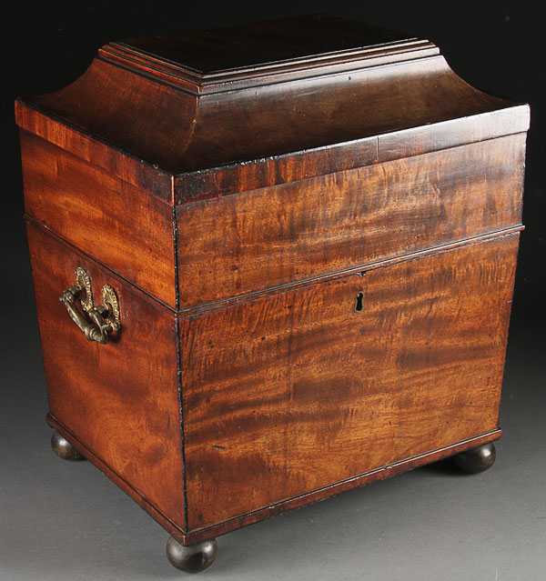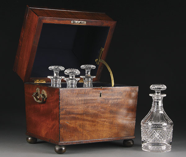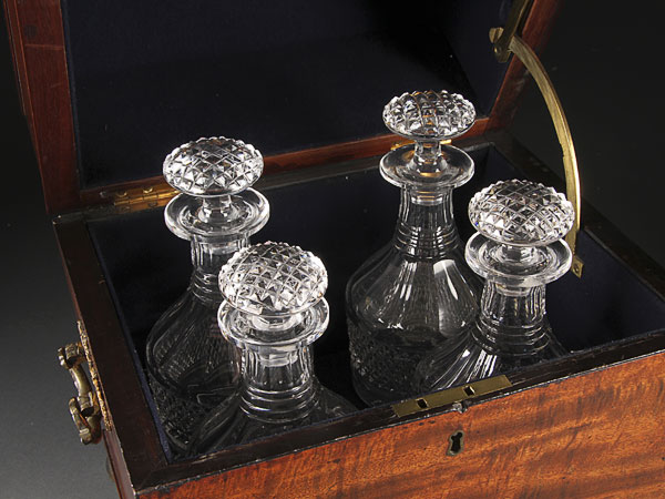 A FINE ENGLISH REGENCY CUT GLASS AND MAHOGANY CASED TANTALUS. Containing four matching cut glass bottles in a hinged mahogany case with gilt bronze handles. Total height 16.5 inches (42 cm).