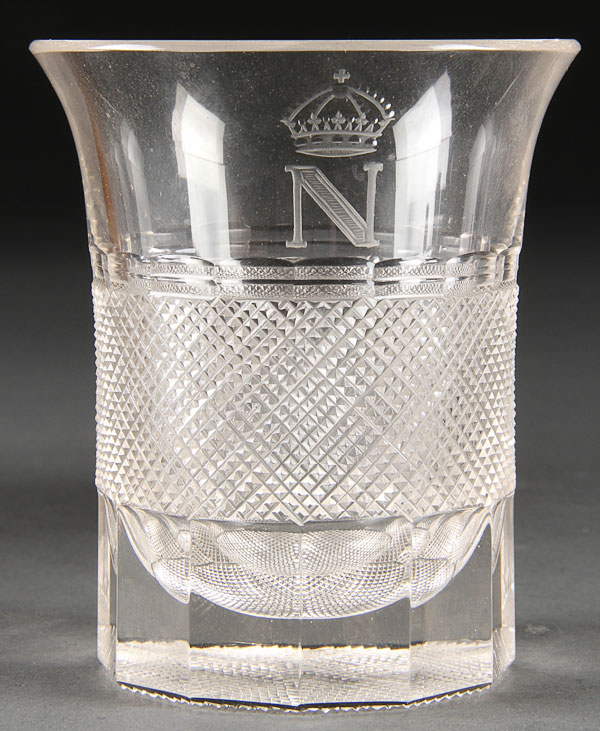 A FRENCH NAPOLEONIC STYLE CUT GLASS AND LEATHER CASED CAMPAIGN TUMBLER, 19TH CENTURY. The tumbler with a fine diamond point cut band below a Napoleonic crown, and contained in a fitted gilt decorated travel case. Total height 4.125 inches (10.5 cm).