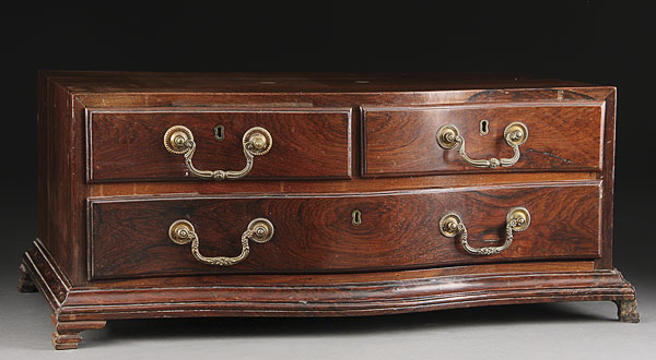 A VERY FINE ENGLISH 19TH CENTURY ROSEWOOD DRESSER CASE. With serpentine front containing three drawers with bale handles, raised on bracketed feet. Length 24 inches (61 cm).