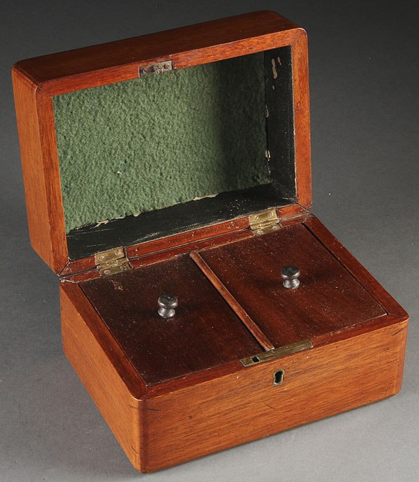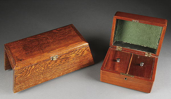 AN ENGLISH 19TH CENTURY TEA BOX. With lidded compartments, together with an oak arts and crafts dresser box. Length 7 inches and 12 inches (17.8 and 30.5 cm).