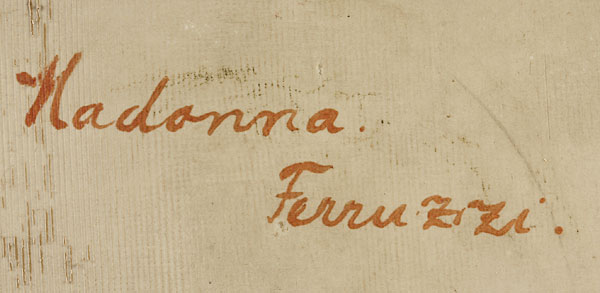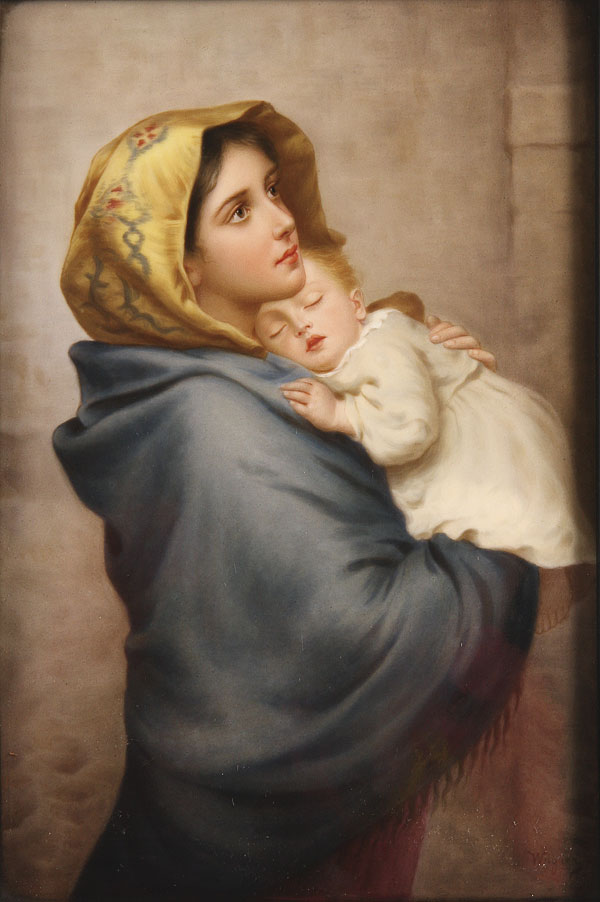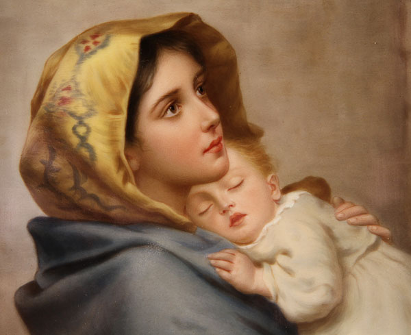 A FINE BERLIN KPM HAND PAINTED PORCELAIN PLAQUE, SIGNED WAGNER, LATE 19TH CENTURY "MADONNA AND CHILD". After Roberto Ferruzzi, signed Wagner lower right, impressed KPM with scepter mark and titled on verso. 9.5 inches x 6.375 inches (24 x 17 cm). Contained in a period Ogee and barley twist wood frame. 16 inches x 12.75 overall (41 x 32.5 cm).