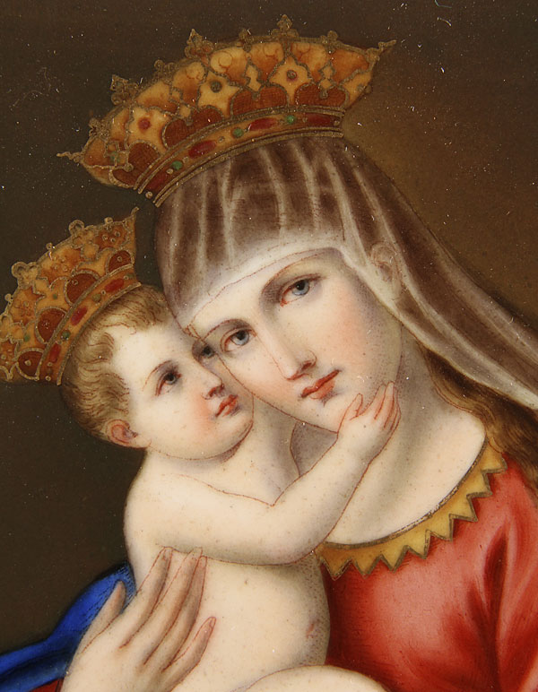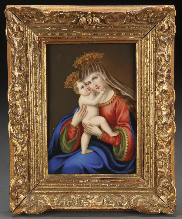 A VERY FINE LIMOGES HAND PAINTED PORCELAIN PLAQUE OF THE MADONNA AND CHILD, LATE 19TH CENTURY. Finely painted with gilt crowns and contained in a wood and gesso gilt rococo frame, the porcelain unmarked. 7.5 inches x 7.25 inches (19 x 14 cm), and 10.25 inches x 8.25 inches (26 x21 cm) overall.