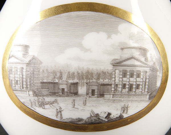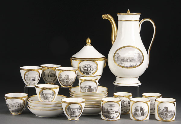 A VERY FINE FRENCH VEIUX PARIS TOPOGRAPHICAL PORCELAIN TEA SERVICE. 25 pieces each with grisaille decorated scenery of various French city and country-scapes, consisting of a coffee pot, covered sugar, six chocolate cups and saucers and six tea cups with five saucers.