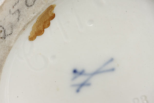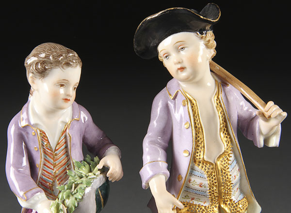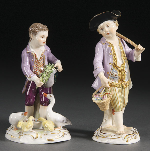 TWO MEISSEN PORCELAIN FIGURES, LATE 19TH/EARLY 20TH CENTURY. Modeled as a young boy gardener and a young boy feeding chickens. Each with crossed blue sword marks under glaze. Height 5 inches to 5.5 inches (12.5 to 14 cm).