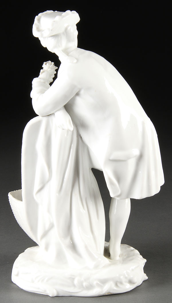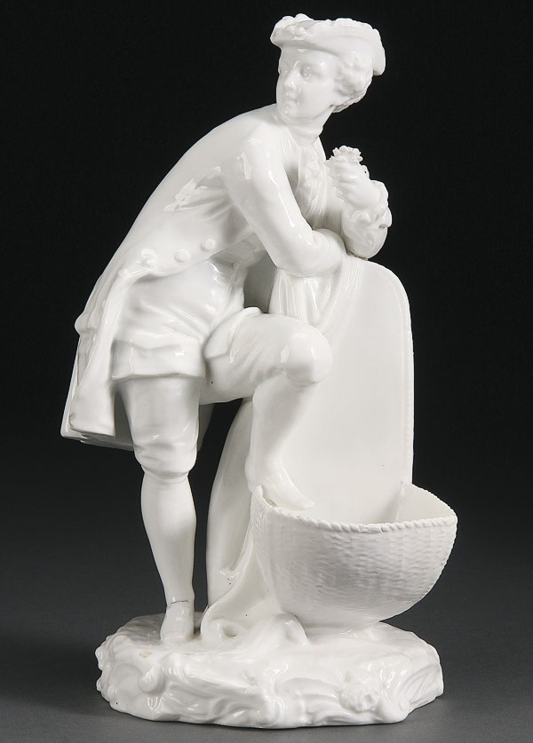 A LARGE MEISSEN STYLE WHITE GLAZED FIGURE OF A GALLANT. Molded as a standing figure with foot resting on a fountain and holding a flower. Crossed blue sword style mark with dot, possibly Chelsea. Height 10.5 inches (27cm).