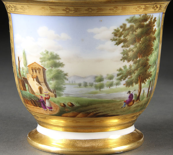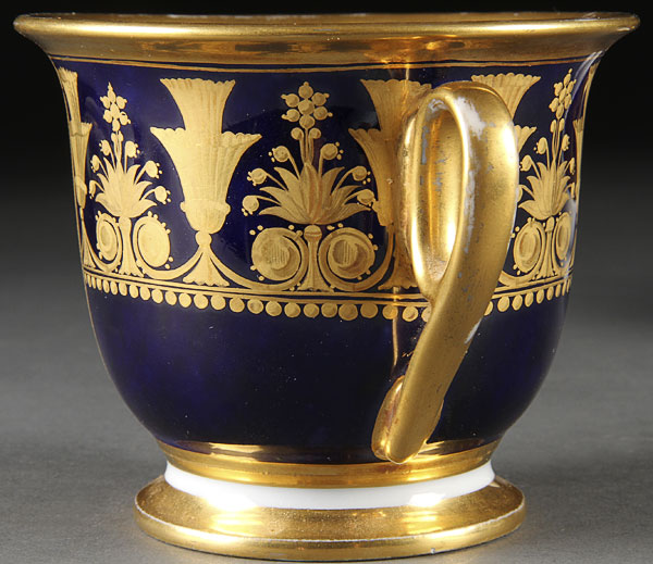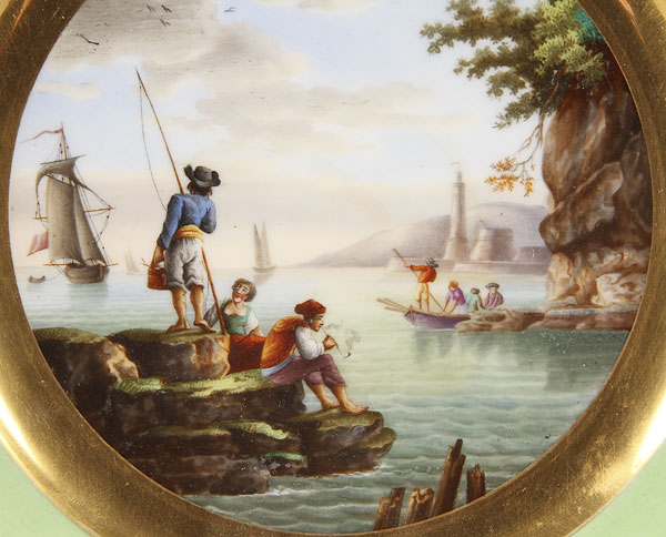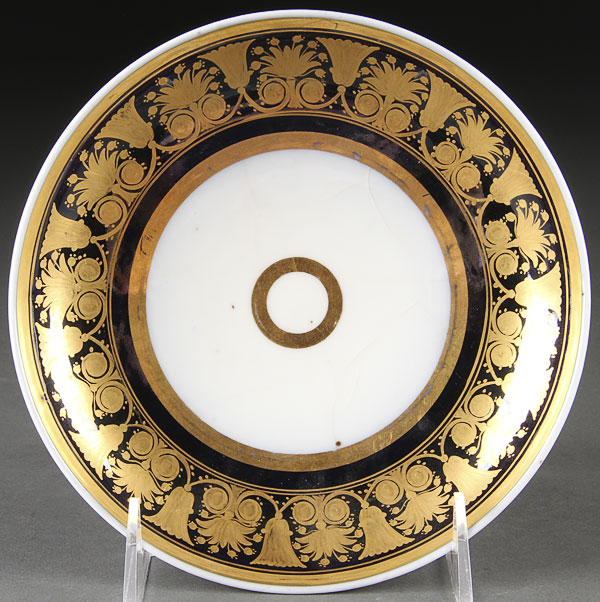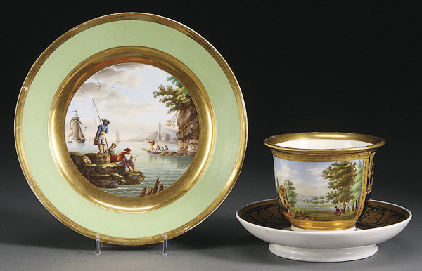 A VERY FINE BERLIN TOPOGRAPHICAL PORCELAIN CUP AND SAUCER, CIRCA 1800. With a fine gilt inverted tassel and foliate border on cobalt ground, together with a Sevres style hand painted plate with coastal fishing scene. Diameter 9 inches (22.8 cm).