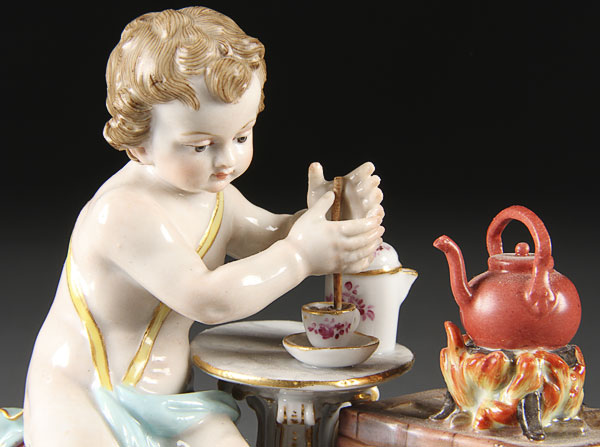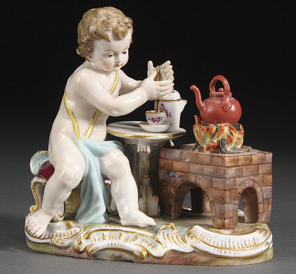 A MEISSEN ALLEGORY OF FIRE, MID-19TH CENTURY. Modeled as a cherub preparing hot chocolate, crossed pommeled swords in underglaze blue, incised c97 and impressed 115. Height 4 inches (10.2 cm).