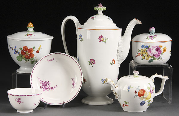 A SIX PIECE GROUP OF EARLY 19TH CENTURY MEISSEN PORCELAIN. Comprising floral decorated coffee pot and associated tea pot and lidded sugar bowls, together with a lavender decorated floral cup and saucer. The largest 10.25 inches (26 cm).
