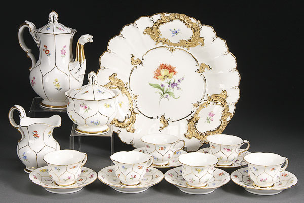 A MEISSEN PORCELAIN TEA SERVICE, 20TH CENTURY. Comprising a tea pot, six cup and saucers, creamer, covered sugar and charger with floral and gilt decoration. The largest 11.75 inches diameter (30 cm).