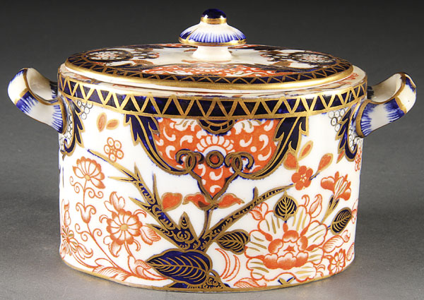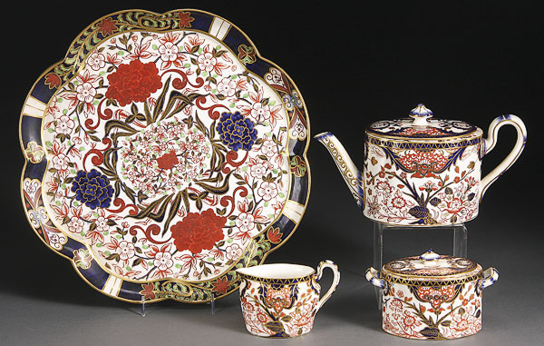 A VERY FINE ROYAL CROWN DERBY PORCELAIN TEA POT, CREAM AND SUGAR, CIRCA 1800. In an Imari pattern number 383, together with a Royal Crown Derby charger number 495. Diameter 14 inches (35.5 cm).