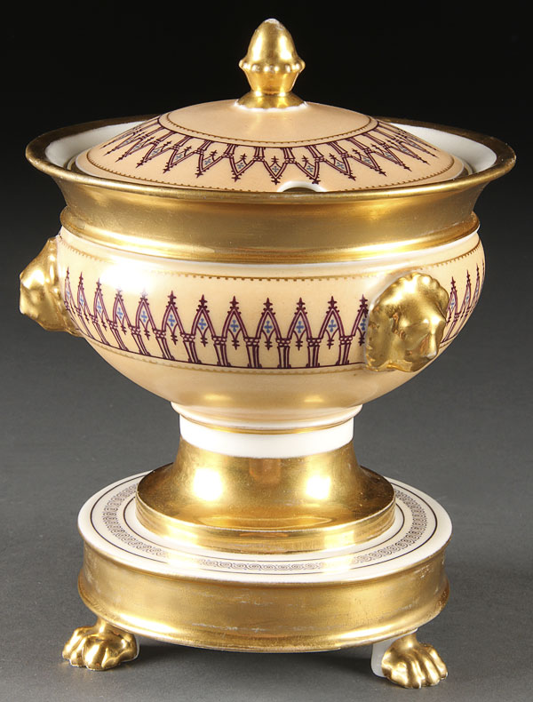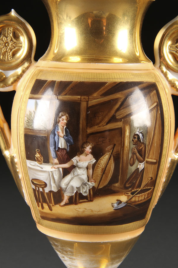 A FRENCH VEIUX PARIS HAND PAINTED SCENIC VASE AND SCHOELCHER LIDDED SAUCE, EARLY 19TH CENTURY. The vase mounted as a lamp, finely painted with a scene of a young couple and African native, the lidded sauce urn raised on a three lions foot plinth. The largest 11 inches (28 cm) as illustrated.