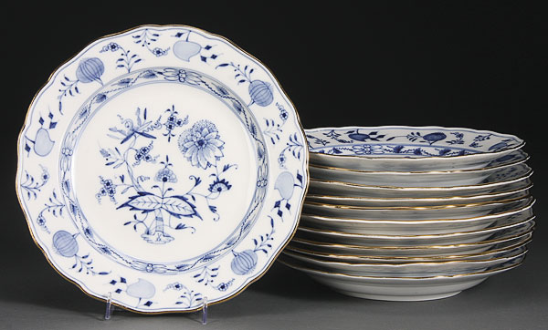 A GROUP OF 12 MEISSEN BLUE ONION DINNER PLATES, 20TH CENTURY. Each with gilt rims, one damaged. Diameter 9.75 inches (24.5 cm).