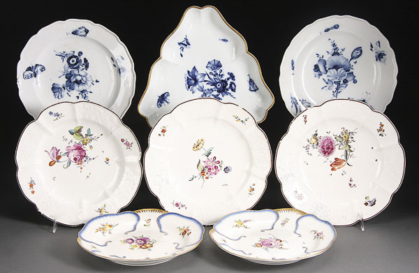 A MEISSEN AND HOCHST, 18TH AND 19TH CENTURY GERMAN PORCELAIN GROUP. Comprising three 18th century Hochst floral decorated plates, two early 19th century Meissen blue decorated floral and butterfly plates, two early Meissen floral, gilt and blue scalloped plates, and a Meissen blue decorated three corner bowl. The largest, 10.75 inches (27 cm).